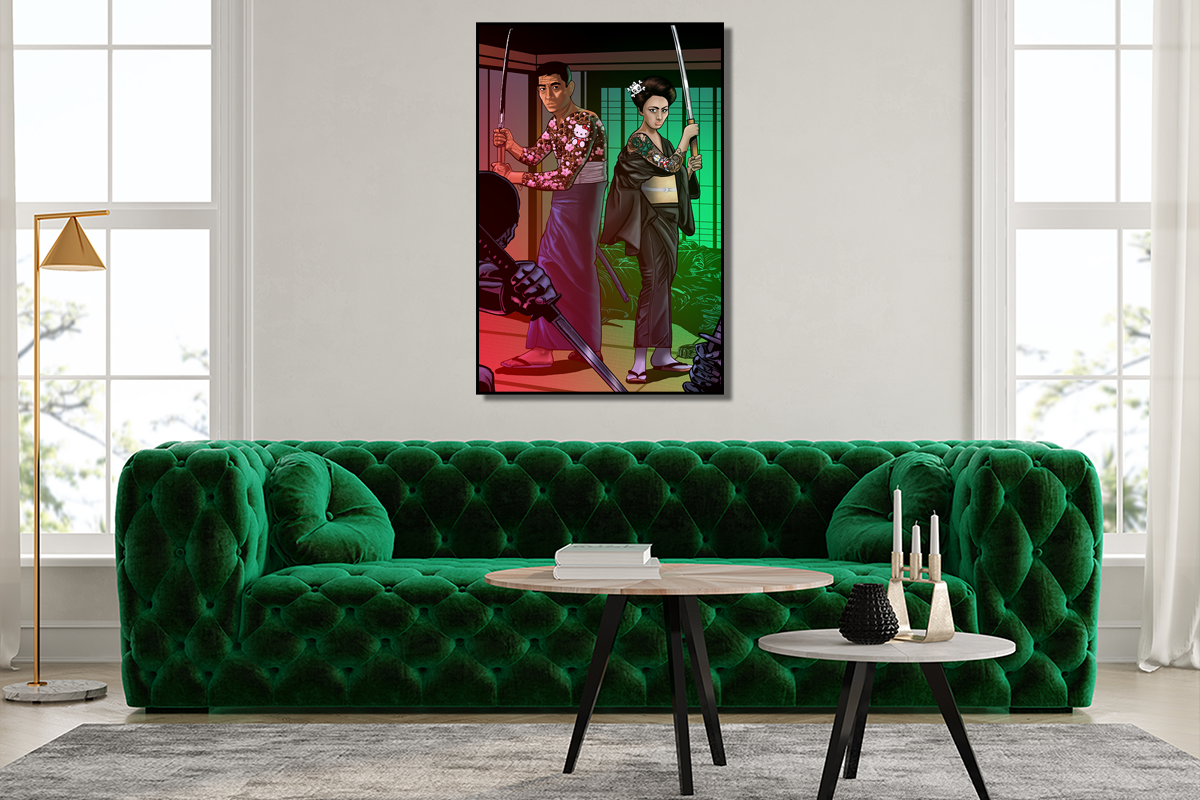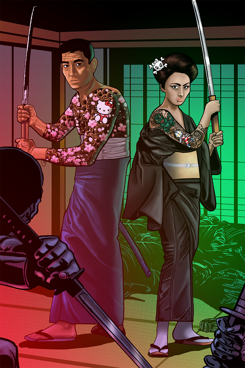 The final stand two Yakuza swords people against the mob of killers. Their tattoos are an inspiration to others of just how cool and deadly they are. This pop art series is my spin on Kimonos, Yakuza films, Japanese Pop Culture and Neo-Noir. These different worlds are clashing together in the best way possible to tell interesting stories.