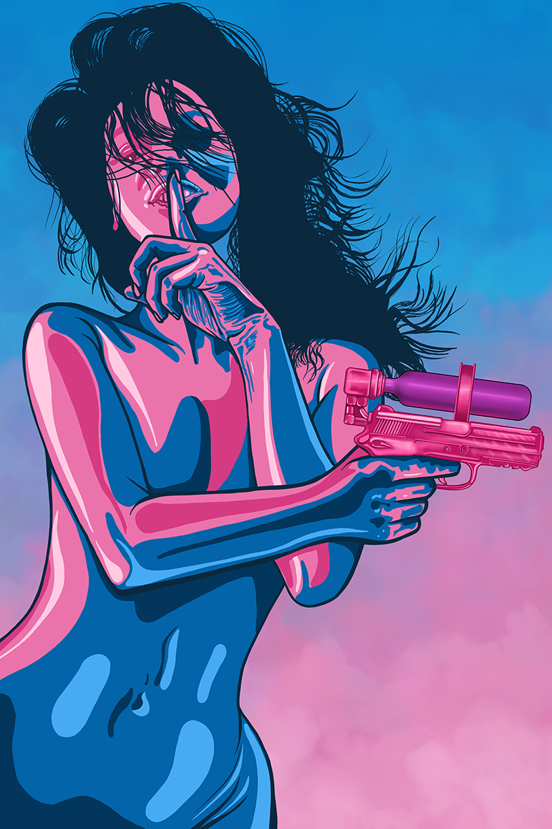 This pop art series titled water guns inspiration comes from mixing different pop culture iconic elements together to tell a new story. A mixture of power and danger with the whimsical elements of toy guns. The bright saturated color combinations make this an exciting pop art piece that fun and deadly together.